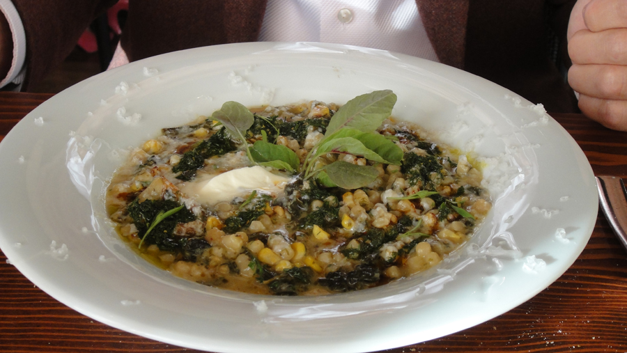 The main course dish: From the menu: “today’s fresh extruded ‘seville’ orange fregola, a sardinian toasted pearl pasta