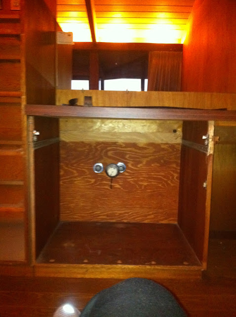As you may have noticed, the entire room is a lot of wood! Mahogany wood panelling, to be precise. When the desk and drawers were removed, that side of walls was trashed. Our contractor actually managed to find some mahogany panelling and stained it to match the rest of the room.