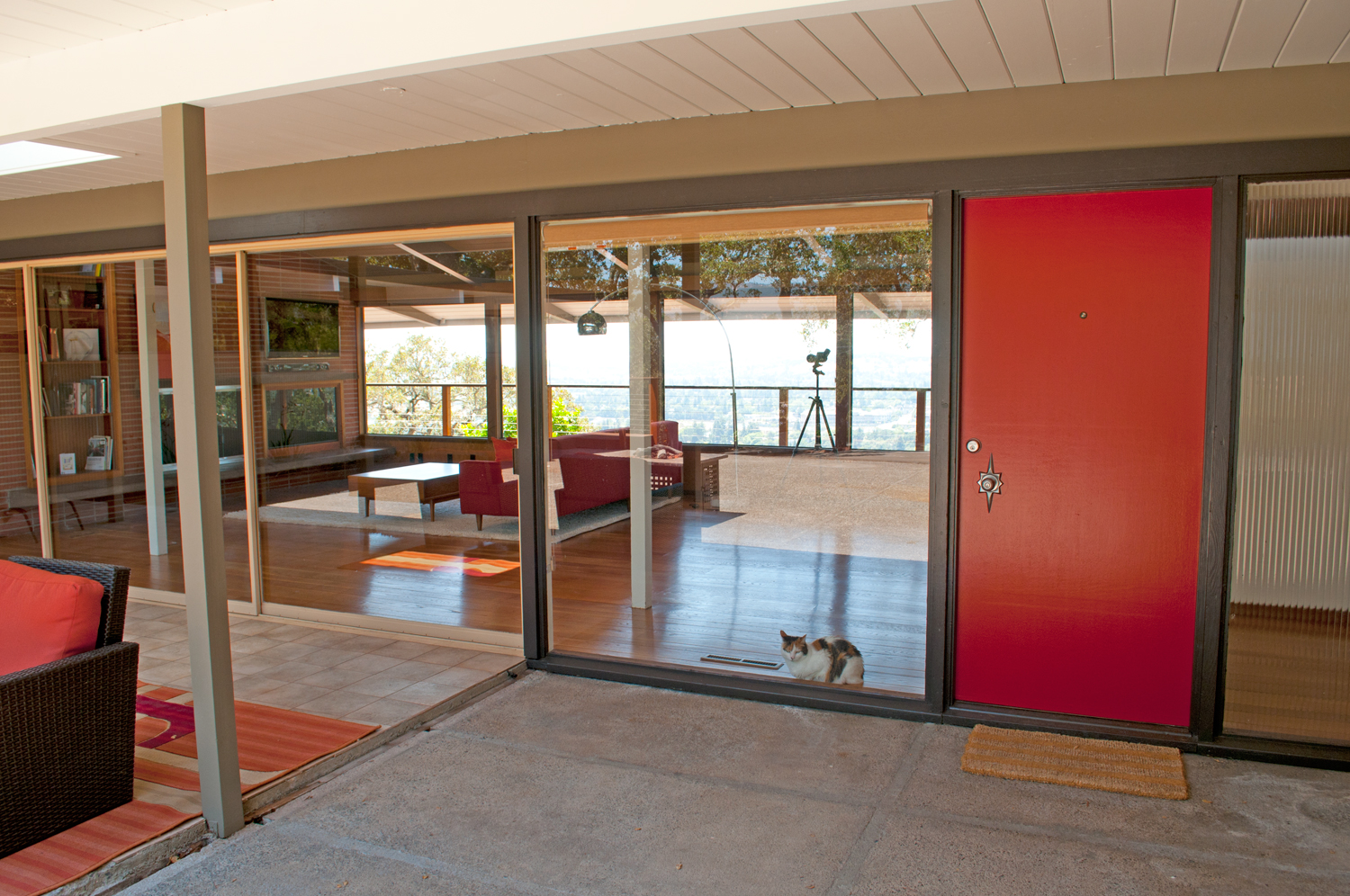 We studied a lot of Eichler homes in Shawns old neighbourhood in Lucas Valley to decide on what colors and accents to paint. We painted a slightly off white under all of the overhangs and the beams in the front. It gives a nice clean look.