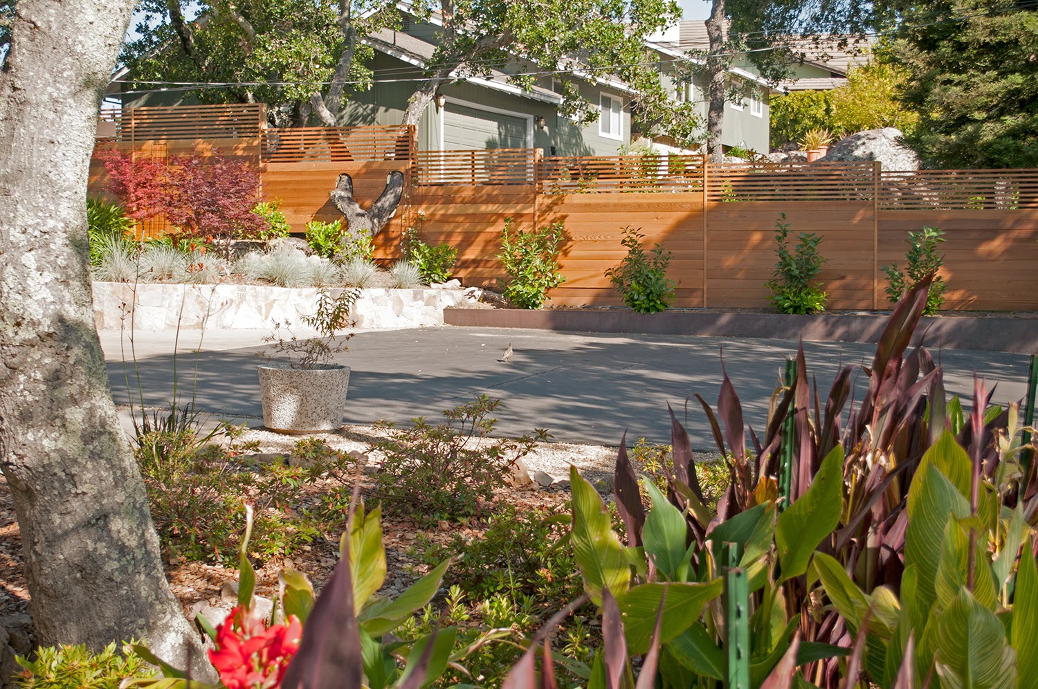 Napa county only allows 6ft of solid fence and 2ft of lattice. I believe this is true in a lot of places. So that is what we did, but rather than a traditional lattice we used horizontal boards to give it a more modern look. It is the same clear red cedar, but our contractor milled it on site for us into 1×6 board. Again, thanks to the Houzz.com site for inspiration (below)